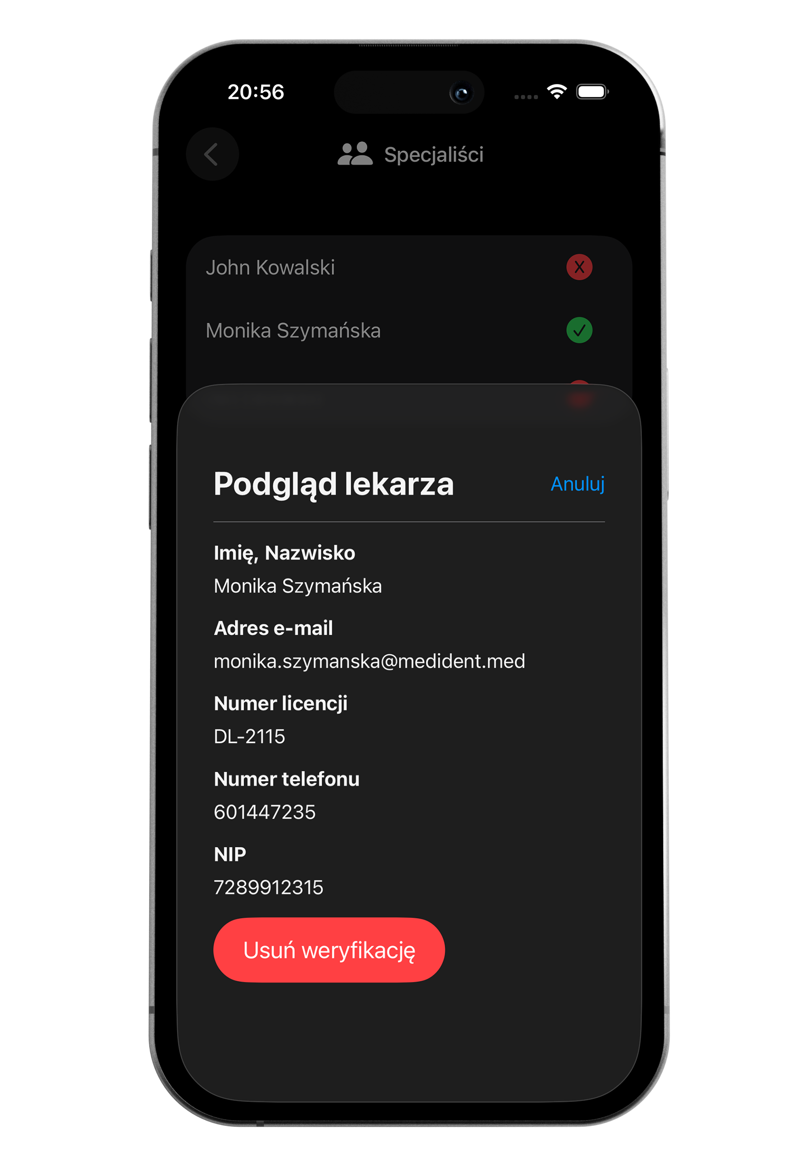 Konto Placówki posiada możliwość weryfikacji Specjalistów. Wystarczy, że będąc w menu głównym wybierzesz Specjaliści. Tutaj zobaczysz listę wszystkich specjalistów niezależnie od statusu weryfikacji. Jeśli chcesz nadać, lub cofnąć uprawnienia do tworzenia zleceń dla Twojego gabinetu, wystarczy kliknąć na konkretne imię i nazwisko specjalisty, a następnie wybrać Zatwierdź pozytywnie/Usuń weryfikację.
