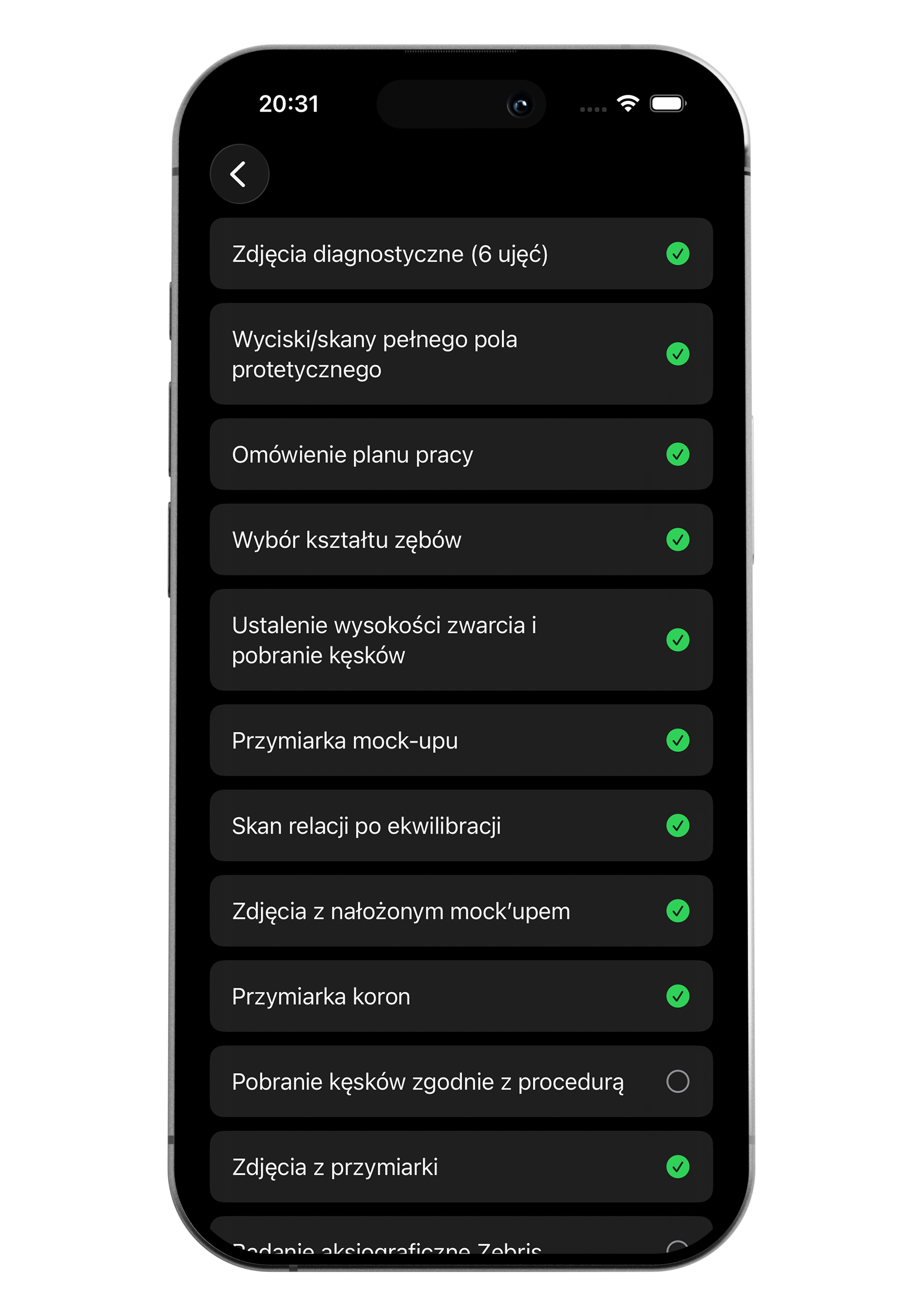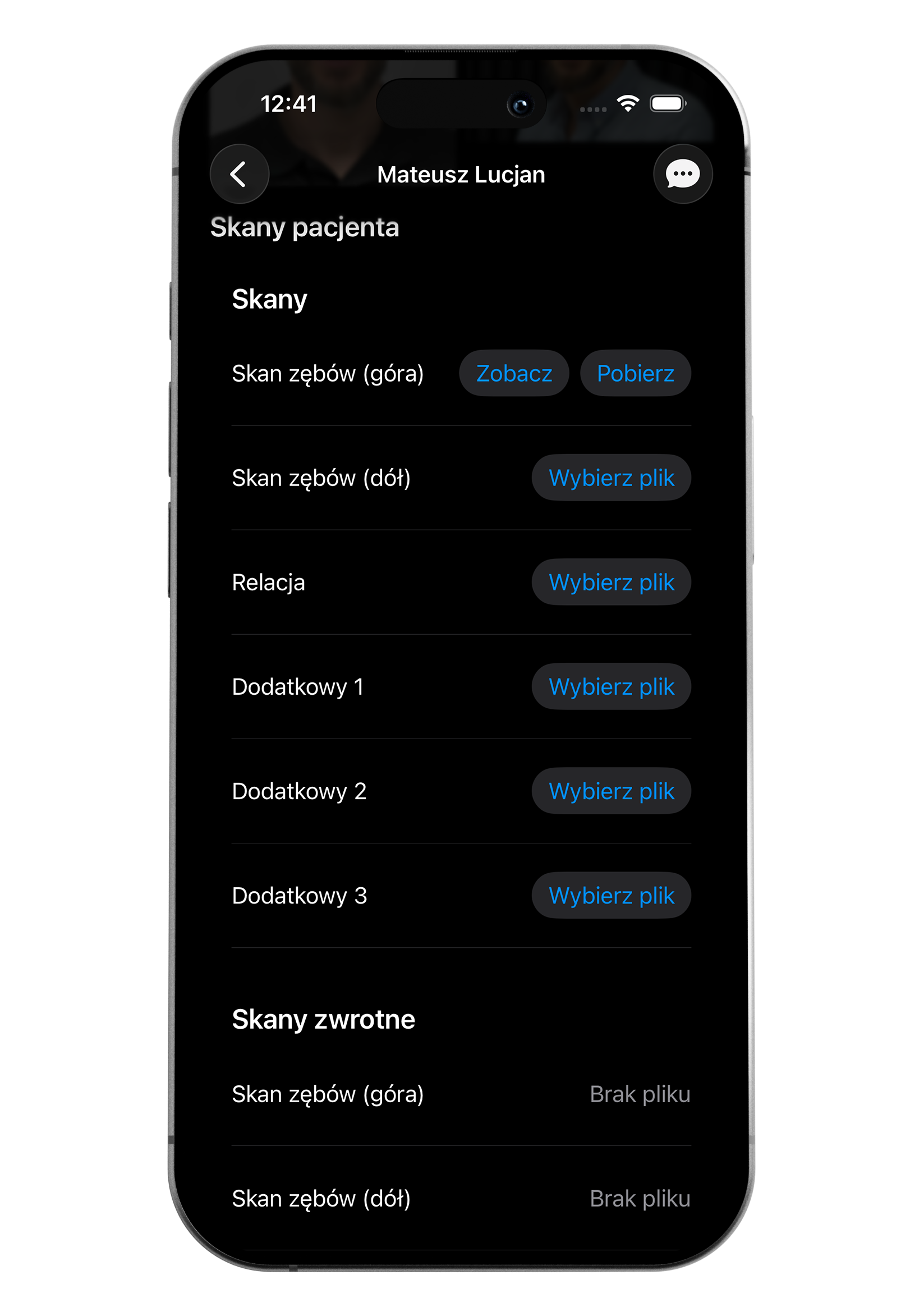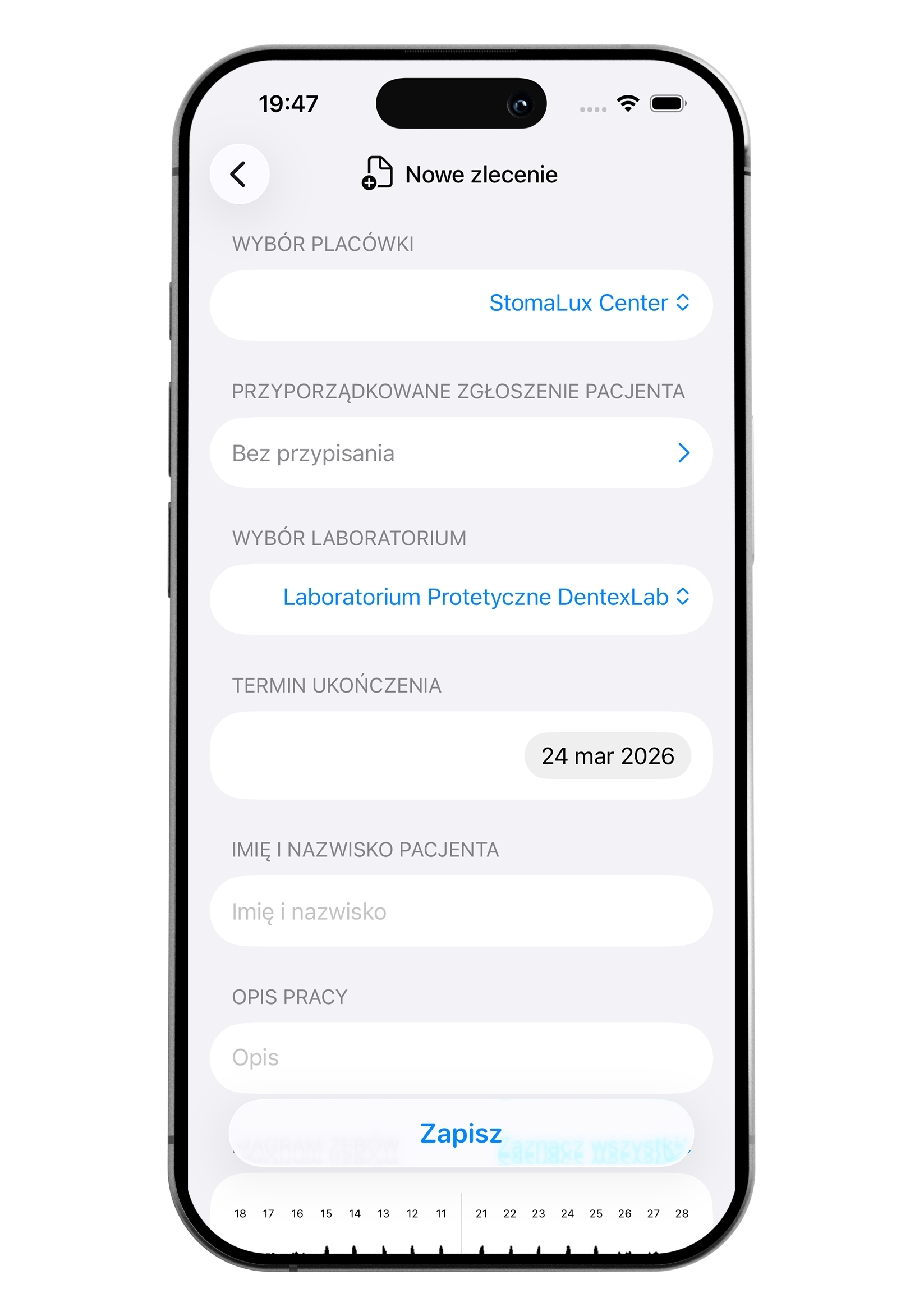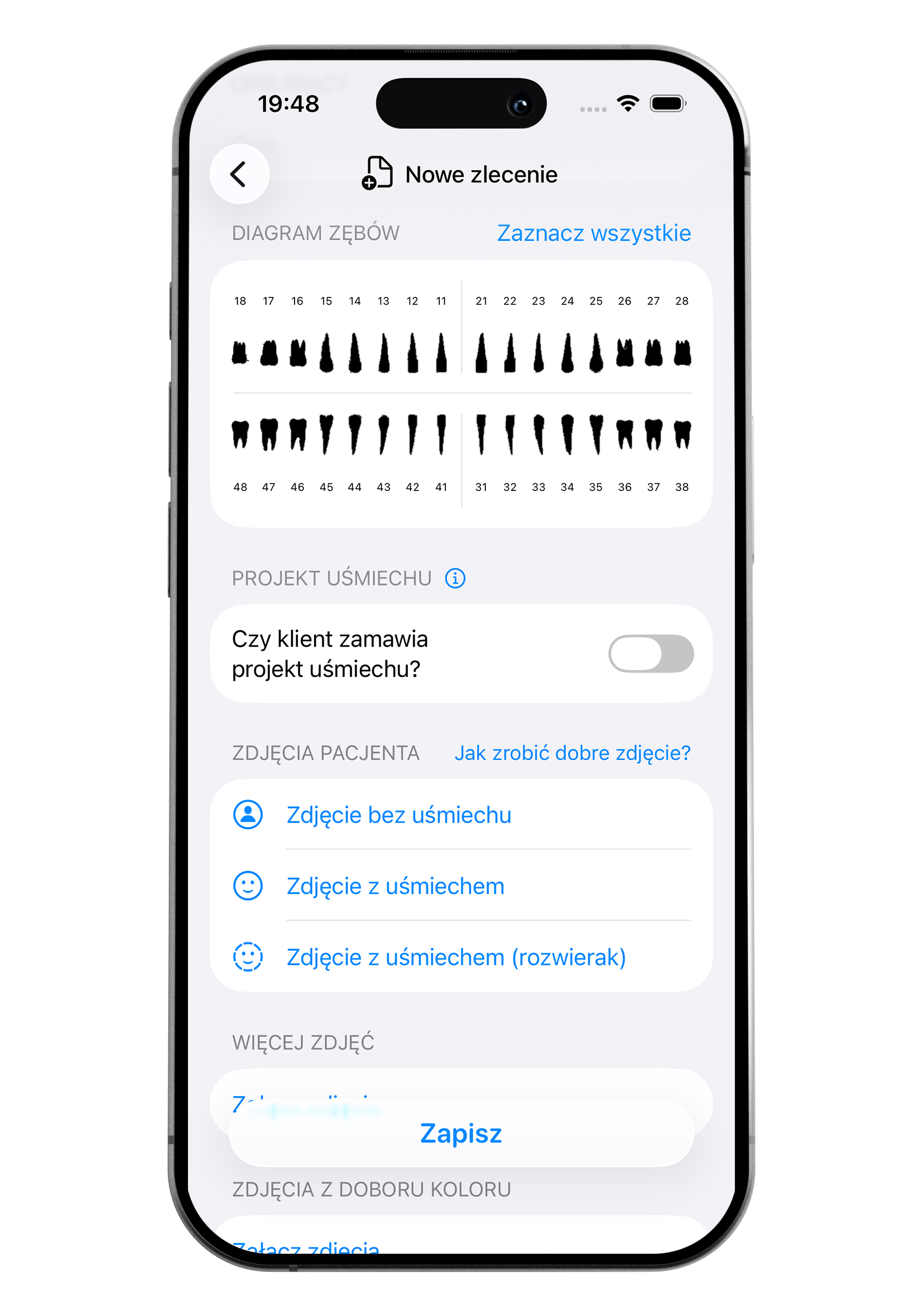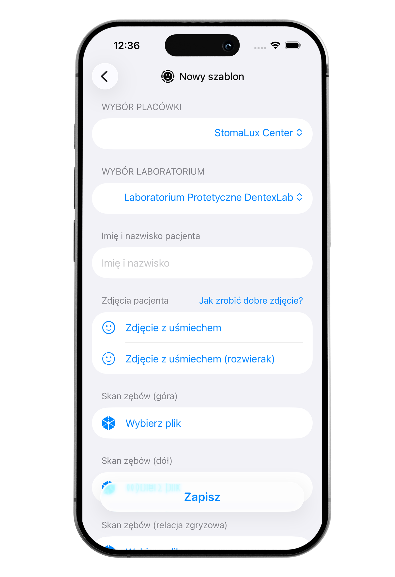 Aby zlecenie mogło zostać przesłane do laboratorium, musi zawierać uzupełnione przynajmniej trzy podstawowe zdjęcia, imię i nazwisko pacjenta oraz opis pracy. Dopiero wtedy przycisk do zapisu na dole ekranu będzie aktywny.