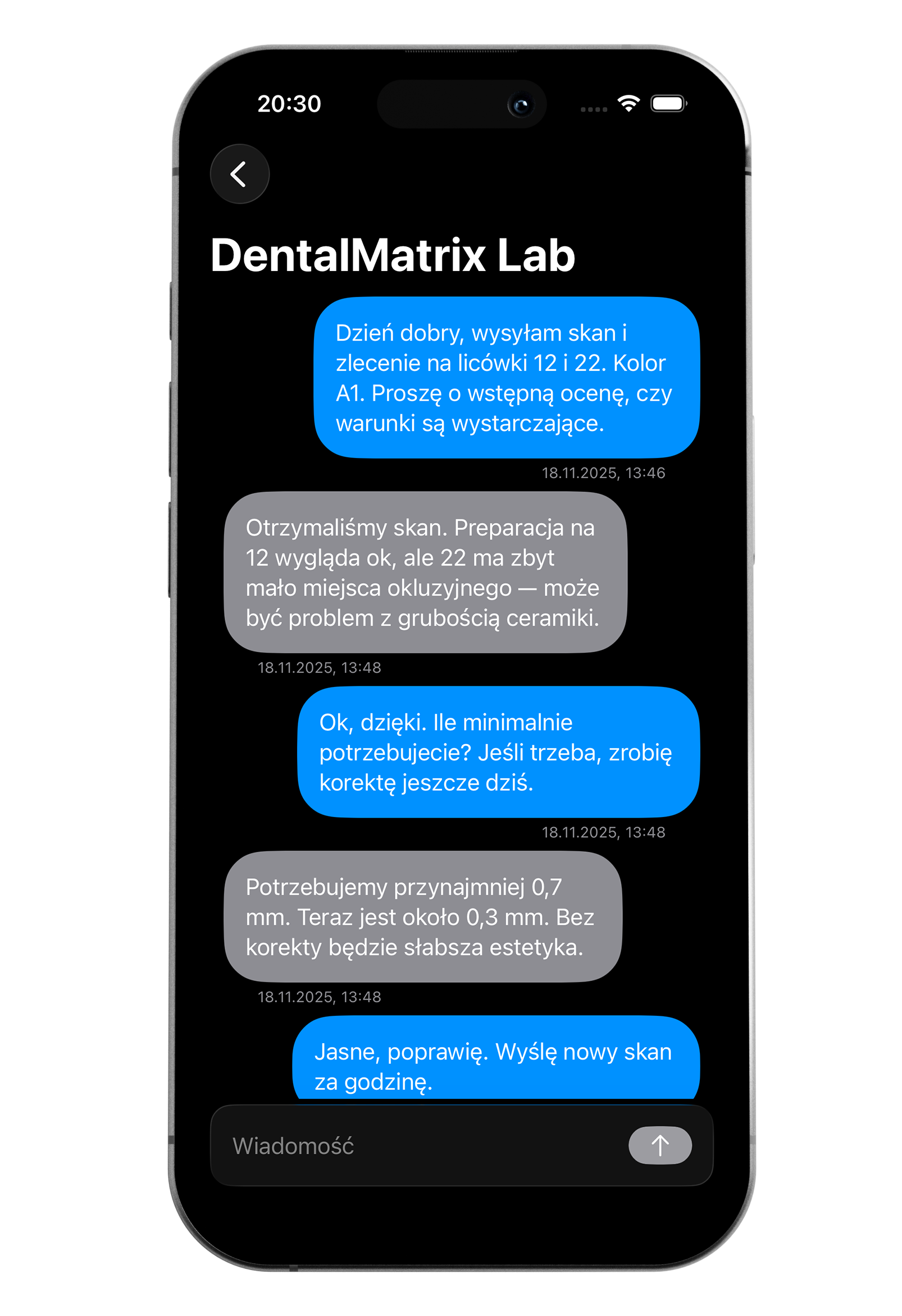 To także w tym miejscu możesz zaproponować nowy termin ukończenia pracy przez laboratorium, dodać komentarz po rozmowie z pacjentem, udostępnić PDF ze zlecenia oraz przejść do dokumentów, czatu z laboratorium i checklisty zlecenia.
